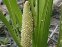 Leaves of Acorus have one wavy margin and an off-center midrib (see photo). Also, all portions of the plant release a sweet, spicy scent when crushed.